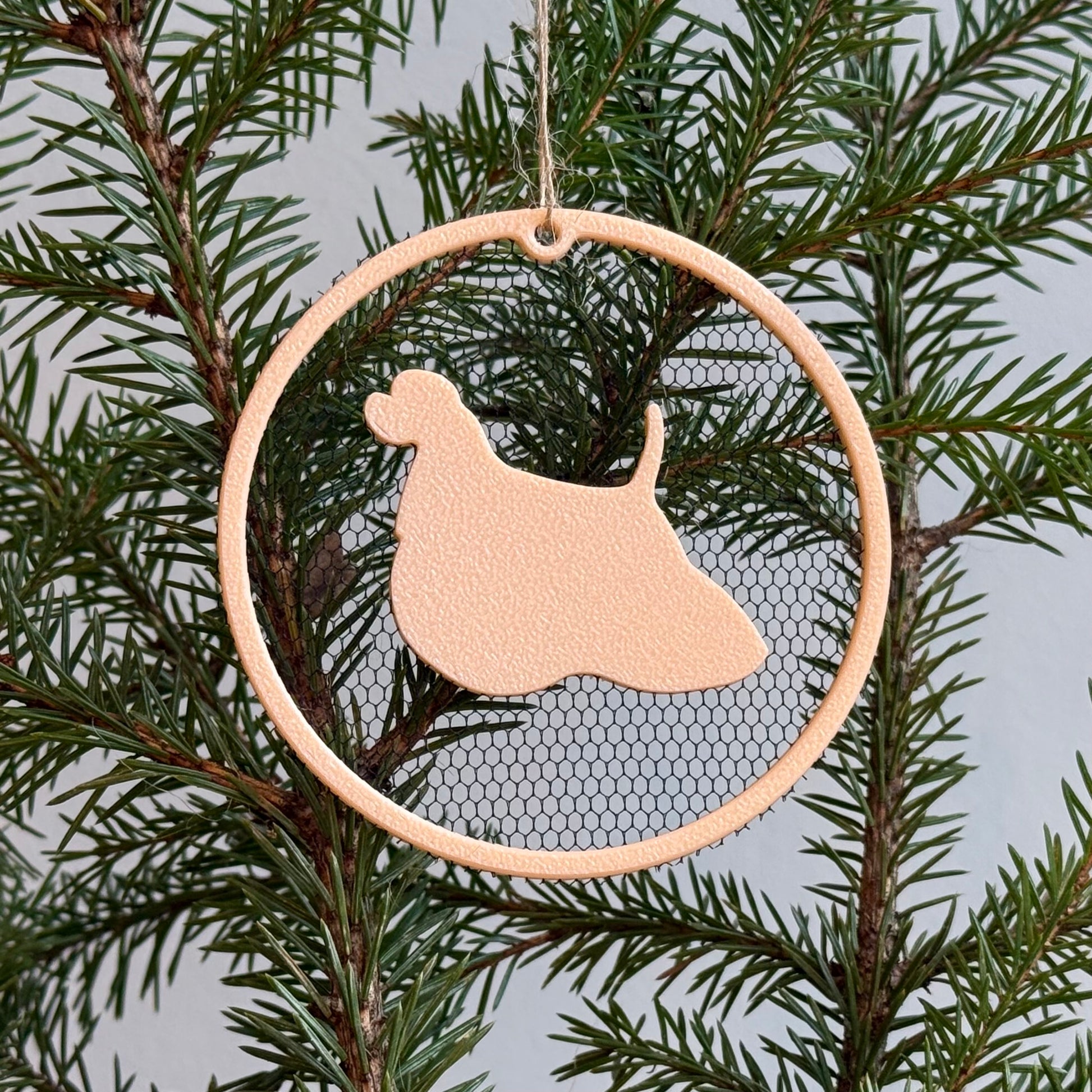 Uniikki ja tyylikäs ripustettava rotukoirakoriste. Se on suunniteltu ja valmistettu täysin Suomessa. Ornamentti on halkaisijaltaan seitsemän (7) senttimetriä. Se 3D-tulostetaan ympäristöystävällisestä PLA:sta. Verkon materiaali on polyesteriä ja MTF:ää. Erikoisvärien kiilto saavutetaan sekoittamalla PLA:han PETG:ä.