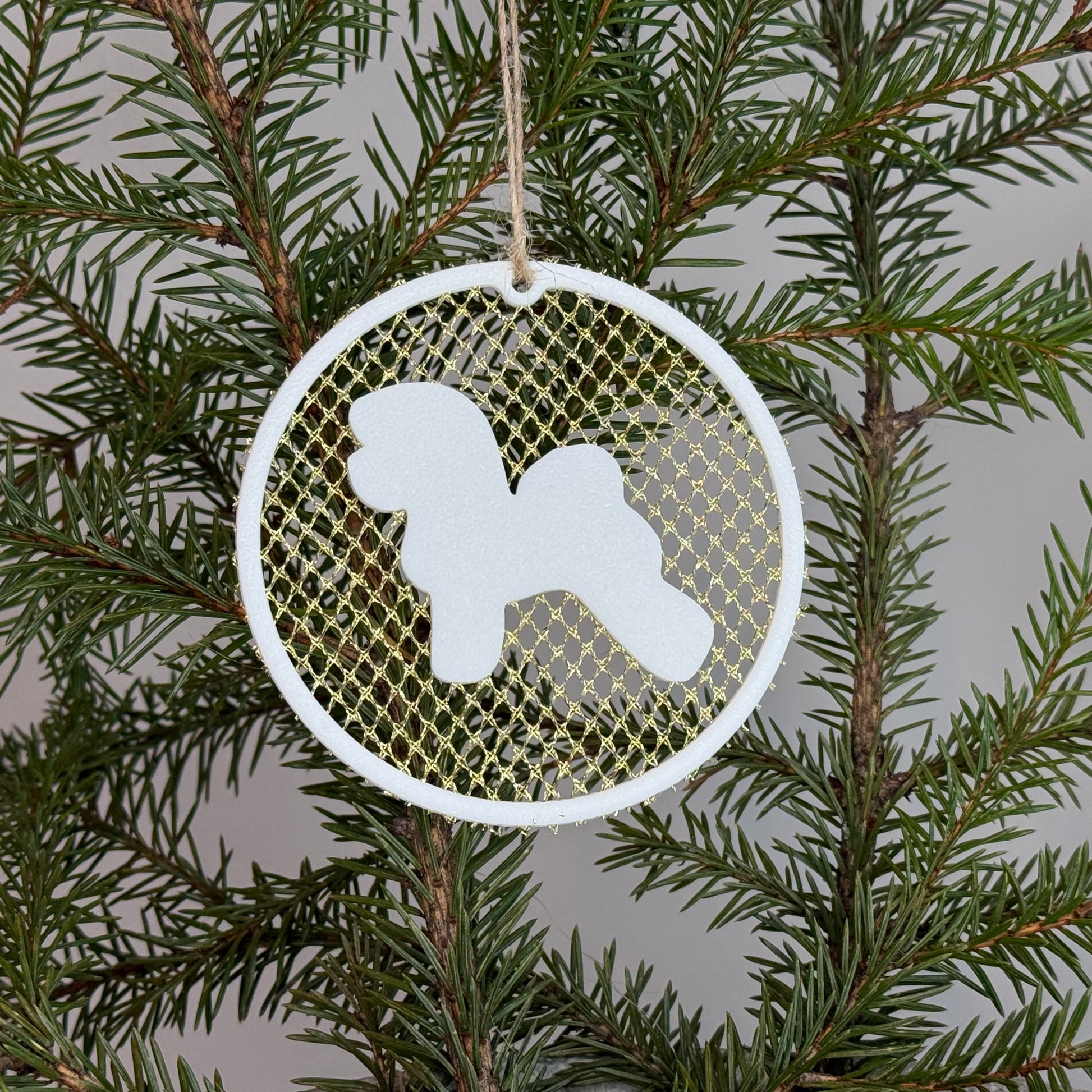 Uniikki ja tyylikäs ripustettava rotukoirakoriste. Se on suunniteltu ja valmistettu täysin Suomessa. Ornamentti on halkaisijaltaan seitsemän (7) senttimetriä. Se 3D-tulostetaan ympäristöystävällisestä PLA:sta. Verkon materiaali on polyesteriä ja MTF:ää. Erikoisvärien kiilto saavutetaan sekoittamalla PLA:han PETG:ä.