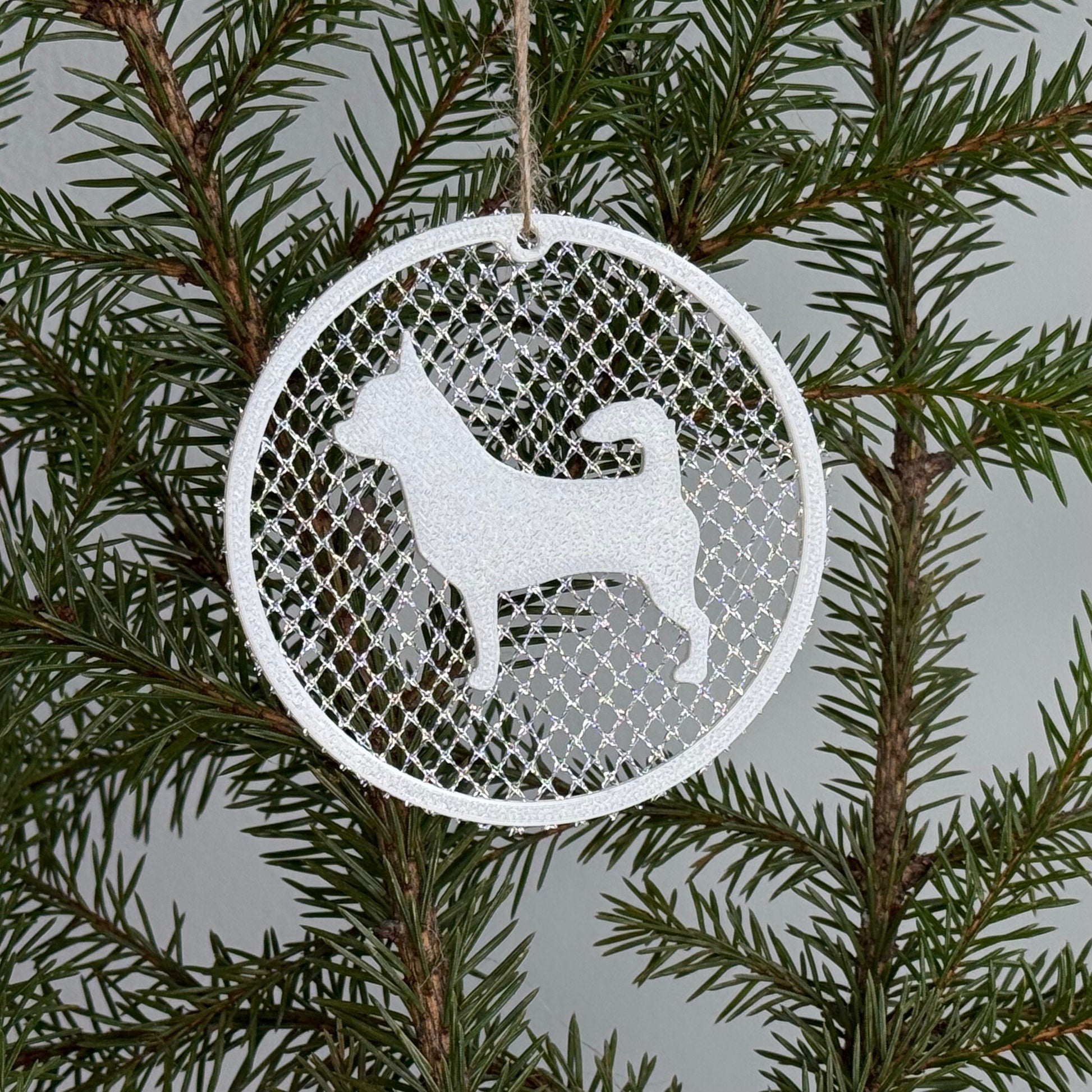 Uniikki ja tyylikäs ripustettava rotukoirakoriste. Se on suunniteltu ja valmistettu täysin Suomessa. Ornamentti on halkaisijaltaan seitsemän (7) senttimetriä. Se 3D-tulostetaan ympäristöystävällisestä PLA:sta. Verkon materiaali on polyesteriä ja MTF:ää. Erikoisvärien kiilto saavutetaan sekoittamalla PLA:han PETG:ä.