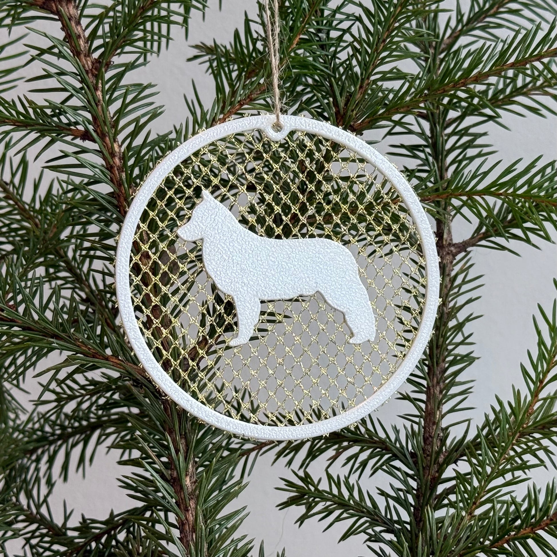 Uniikki ja tyylikäs ripustettava rotukoirakoriste. Se on suunniteltu ja valmistettu täysin Suomessa. Ornamentti on halkaisijaltaan seitsemän (7) senttimetriä. Se 3D-tulostetaan ympäristöystävällisestä PLA:sta. Verkon materiaali on polyesteriä ja MTF:ää. Erikoisvärien kiilto saavutetaan sekoittamalla PLA:han PETG:ä.